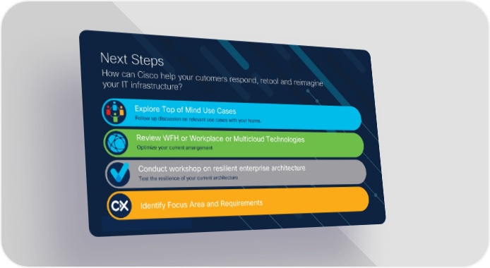 Next Steps How can Cisco help your cutomers respond, retool and reimagine your IT infrastructure? Explore Top of Mind Use Cases Follow up discussion on relevant use cases with your teams. Review WFH or Workplace or Multicloud Technologies Optimize your current arrangement Conduct workshop on resilient enterprise architecture Test the resilience of your current architecture Identify Focus Area and Requirements ©© 2020 2020 CCiisscoco a annd/d/oorr iittss aaffiffilliiaatteess.. AAllll rriighghttss r reesseerrvveed.d. Cisco ASEAN Virtual Partner Conference