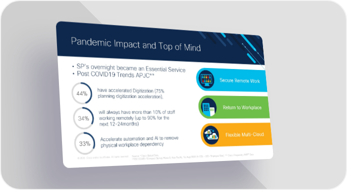 Pandemic Impact and Top of Mind • SP’s overnight became an Essential Service • Post COVID19 Trends APJC** Secure Remote Work 44% have accelerated Digitization (75% planning digitization acceleration), will always have more than 10% of staff Return to Workplace 34% working remotely (up to 90% for the next 12-24months) 33% Accelerate automation and AI to remove Flexible Multi-Cloud physical workplace dependency © 2020 Cisco and/or its affiliates. All rights reserved. Source: *Cisco Global Data, Cisco ASEAN Virtual Partner Conference **IDC COVID-19 Impact Survey Wave 9, Asia Pacific, 1st Aug 2020 (N=305 - 500+ Employee Size), *** Cisco / Kaspersky / MSFT Data