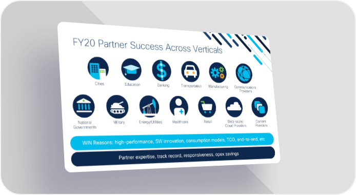 FY20 Partner Success Across Verticals Cities Education Banking Transportation Manufacturing Communications Providers National Military Energy/Utilities Healthcare Retail Web-scale/ Content Governments Cloud Providers Providers WIN Reasons: high-performance, SW innovation, consumption models, TCO, end-to-end, etc Partner expertise, track record, responsiveness, opex savings © 2020 Cisco and/or its affiliates. All rights reserved. Cisco ASEAN Virtual Partner Conference