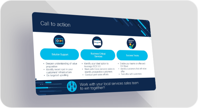 Call to action Solution Support Business Critical Success Tracks Services • Deepen understanding of value • Identify your ideal option to • Enable your teams on offer and proposition leverage BCS 3.0 CX Cloud • Identify sweet spot in your • Work with Cisco services sales to • Identify customers that will value customers’ infrastructure identify prospective customers offer • Do targeted upselling • Conduct joint sales efforts • Test offer with customers Work with your local services sales team © 2020 Cisco and/or its affiliates. All rights reserved. to win together!! Cisco ASEAN Virtual Partner Conference