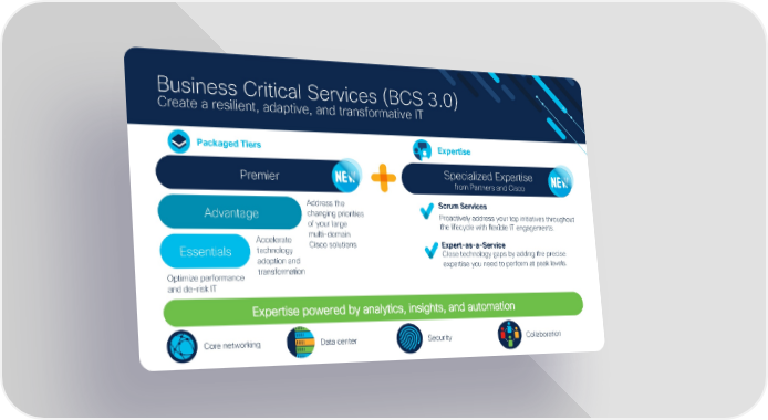 Business Critical Services (BCS 3.0) Create a resilient, adaptive, and transformative IT Packaged Tiers Expertise Premier Specialized Expertise from Partners and Cisco Address the Scrum Services Advantage changing priorities Proactively address your top initiatives throughout of your large the lifecycle with flexible IT engagements. Accelerate multi-domain Essentials technology Cisco solutions Expert-as-a-Service adoption and Close technology gaps by adding the precise transformation expertise you need to perform at peak levels. Optimize performance and de-risk IT Expertise powered by analytics, insights, and automation Core networking Data center Security Collaboration © 2020 Cisco and/or its affiliates. All rights reserved. Cisco ASEAN Virtual Partner Conference