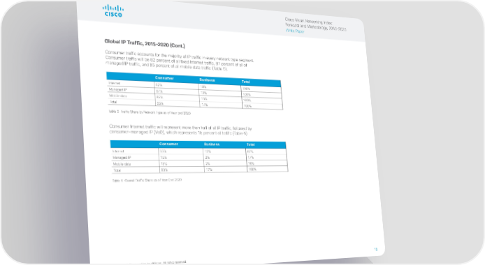 Cisco Visual Networking Index: Forecast and Methodology, 2015–2020 White Paper Global IP Traffic, 2015–2020 (Cont.) Consumer traffic accounts for the majority of IP traffic in every network type segment. Consumer traffic will be 82 percent of all fixed Internet traffic, 87 percent of all of managed IP traffic, and 85 percent of all mobile data traffic (Table 5). Consumer Business Total Internet 82% 18% 100% Managed IP 87% 13% 100% Mobile data 85% 15% 100% Total 83% 17% 100% Table 5 Traffic Share by Network Type as of Year End 2020 Consumer Internet traffic will represent more than half of all IP traffic, followed by consumer-managed IP (VoD), which represents 15 percent of traffic (Table 6). Consumer Business Total Internet 55% 12% 67% Managed IP 15% 2% 17% Mobile data 13% 2% 16% Total 83% 17% 100% Table 6 Overall Traffic Share as of Year End 2020 © 2016 Cisco and/or its affiliates. All rights reserved. 12