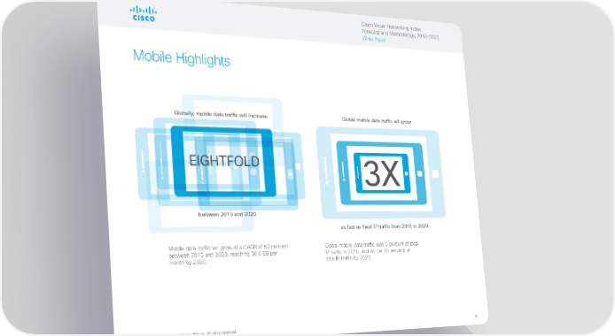 Cisco Visual Networking Index: Forecast and Methodology, 2015–2020 White Paper Mobile Highlights Globally, mobile data traffic will increase Global mobile data traffic will grow EIGHTFOLD 3X between 2015 and 2020. as fast as fixed IP traffic from 2015 to 2020. Mobile data traffic will grow at a CAGR of 53 percent Global mobile data traffic was 5 percent of total between 2015 and 2020, reaching 30.6 EB per IP traffic in 2015, and will be 16 percent of month by 2020. total IP traffic by 2020. © 2016 Cisco and/or its affiliates. All rights reserved. 4