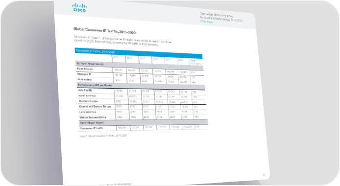 Cisco Visual Networking Index: Forecast and Methodology, 2015–2020 White Paper Global Consumer IP Traffic, 2015–2020 As shown in Table 7, global consumer IP traffic is expected to reach 162 EB per month in 2020. Most of today’s consumer IP traffic is Internet traffic. Consumer IP Traffic, 2015–2020 2015 2016 2017 2018 2019 2020 CAGR 2015–2020 By Type (PB per Month) Fixed Internet 39,345 48,223 59,294 72,442 88,399 107,375 22% Managed IP 16,166 18,969 21,686 24,320 26,687 28,754 12% Mobile data 3027 5127 8326 12,609 18,436 26,080 54% By Geography (PB per Month) Asia Pacific 19,869 24,359 30,138 37,265 45,942 56,494 23% North America 21,240 26,071 31,398 37,244 43,291 50,008 19% Western Europe 8922 10,896 13,277 15,899 19,222 22,876 21% Central and Eastern Europe 3753 4769 6229 8143 10,787 13,885 30% Latin America 3502 4365 5450 6649 8069 9838 23% Middle East and Africa 1253 1860 2815 4172 6209 9108 49% Total (PB per Month) Consumer IP traffic 58,539 72,320 89,306 109,371 133,521 162,209 23% Table 7 Global Consumer IP Traffic, 2015–2020 © 2016 Cisco and/or its affiliates. All rights reserved. 13