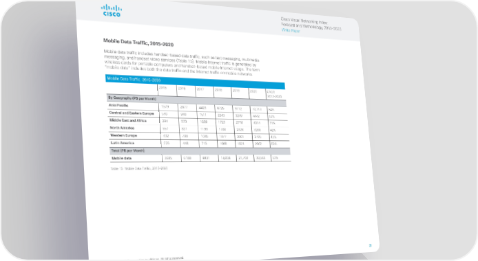 Cisco Visual Networking Index: Forecast and Methodology, 2015–2020 White Paper Mobile Data Traffic, 2015–2020 Mobile data traffic includes handset-based data traffic, such as text messaging, multimedia messaging, and handset video services (Table 15). Mobile Internet traffic is generated by wireless cards for portable computers and handset-based mobile Internet usage. The term “mobile data” includes both the data traffic and the Internet traffic on mobile networks. Mobile Data Traffic, 2015–2020 2015 2016 2017 2018 2019 2020 CAGR 2015–2020 By Geography (PB per Month) Asia Pacific 1579 2677 4423 6725 9772 13,713 54% Central and Eastern Europe 546 946 1511 2243 3249 4442 52% Middle East and Africa 294 570 1039 1723 2778 4314 71% North America 557 831 1199 1700 2328 3208 42% Western Europe 432 708 1045 1477 2061 2795 45% Latin America 276 448 715 1066 1521 2092 50% Total (PB per Month) Mobile data 3685 6180 9931 14,934 21,708 30,564 53% Table 15 Mobile Data Traffic, 2015–2020 © 2015 Cisco and/or its affiliates. All rights reserved. 21