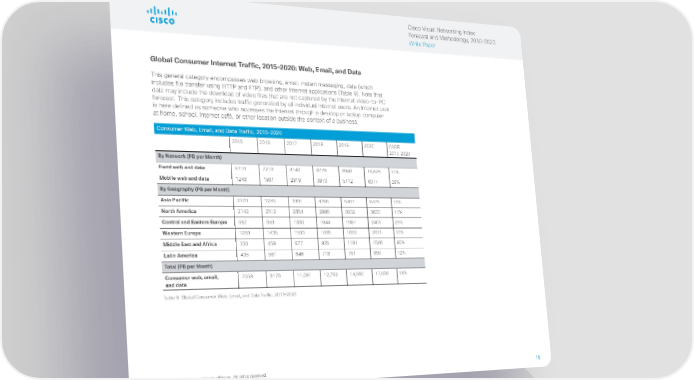 Cisco Visual Networking Index: Forecast and Methodology, 2015–2020 White Paper Global Consumer Internet Traffic, 2015–2020: Web, Email, and Data This general category encompasses web browsing, email, instant messaging, data (which includes file transfer using HTTP and FTP), and other Internet applications (Table 9). Note that data may include the download of video files that are not captured by the Internet video-to-PC forecast. This category includes traffic generated by all individual Internet users. An Internet user is here defined as someone who accesses the Internet through a desktop or laptop computer at home, school, Internet café, or other location outside the context of a business. Consumer Web, Email, and Data Traffic, 2015–2020 2015 2016 2017 2018 2019 2020 CAGR 2015–2020 By Network (PB per Month) Fixed web and data 6310 7210 8142 8779 8948 10,629 11% Mobile web and data 1248 1961 2919 3973 5112 6377 39% By Geography (PB per Month) Asia Pacific 2670 3245 3991 4766 5407 6475 19% North America 2142 2512 2854 2995 3032 3633 11% Central and Eastern Europe 682 959 1300 1644 1987 2401 29% Western Europe 1269 1435 1593 1695 1692 2021 10% Middle East and Africa 300 459 677 935 1191 1586 40% Latin America 495 561 646 718 751 890 12% Total (PB per Month) Consumer web, email, 7558 9170 11,061 12,752 14,060 17,006 18% and data Table 9 Global Consumer Web, Email, and Data Traffic, 2015–2020 © 2016 Cisco and/or its affiliates. All rights reserved. 15