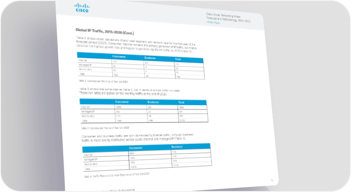 Cisco Visual Networking Index: Forecast and Methodology, 2015–2020 White Paper Global IP Traffic, 2015–2020 (Cont.) Table 2 shows cross-tabulations of end-user segment and network type for the final year of the forecast period (2020). Consumer Internet remains the primary generator of IP traffic, but mobile data has the highest growth rate and begins to generate significant traffic by 2020 (Table 2). Consumer Business Total Internet 107 23 131 Managed IP 29 4 33 Mobile data 26 4 31 Total 162 32 194 Table 2 Exabytes per Month as of Year End 2020 Table 3 shows the same data as Table 2, but in terms of annual traffic run rates. These run rates are based on the monthly traffic at the end of 2020. Consumer Business Total Internet 1288 281 1569 Managed IP 345 52 397 Mobile data 313 54 367 Total 1947 386 2332 Table 3 Exabytes per Year as of Year End 2020 Consumer and business traffic are both dominated by Internet traffic, although business traffic is more evenly distributed across public Internet and managed IP (Table 4). Consumer Business Internet 66% 73% Managed IP 18% 13% Mobile data 16% 14% Total 100% 100% Table 4 Traffic Share by End-User Segment as of Year End 2020 © 2016 Cisco and/or its affiliates. All rights reserved. 11
