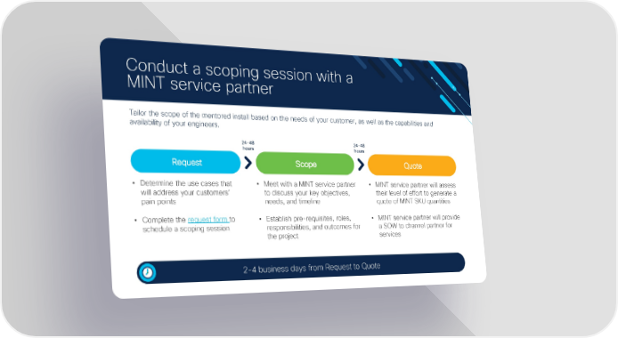 Conduct a scoping session with a MINT service partner Tailor the scope of the mentored install based on the needs of your customer, as well as the capabilities and availability of your engineers. 24-48 24-48 hours hours Request Scope Quote • Determine the use cases that • Meet with a MINT service partner • MINT service partner will assess will address your customers’ to discuss your key objectives, their level of effort to generate a pain points needs, and timeline quote of MINT SKU quantities • Complete the request form to • Establish pre-requisites, roles, • MINT service partner will provide schedule a scoping session responsibilities, and outcomes for a SOW to channel partner for the project services 2-4 business days from Request to Quote © 2020 Cisco and/or its affiliates. All rights reserved. Cisco ASEAN Virtual Partner Conference