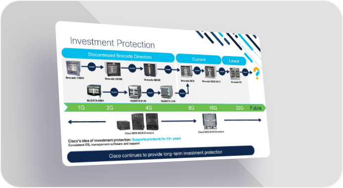 Investment Protection Discontinued Brocade Directors Current Latest Forklift Forklift Forklift Forklift Forklift Forklift Brocade12000 Brocade 24000 Brocade 48000 Brocade DCX Brocade DCX 8510 Brocade X6 Brocade X6 Forklift Forklift Forklift McDATA 6064 McDATA 6140 McDATA i10K 1G 2G 4G 8G 16G 32G Future Cisco MDS 9500 Directors Cisco MDS 9700 Directors Cisco’s idea of investment protection: Supports products for 10+ years Consistent OS, management software and support © 2020 Cisco and/or its affiliates. All rights reserved. Cisco ASEAN Virtual Partner Conference Cisco continues to provide long-term investment protection
