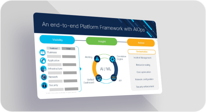 An end-to-end Platform Framework with AIOps Visibility Insight Action Traditional Cloud Orchestration Business Alerting Correlation Incident Management Application Engine Resource scaling Infrastructure AI / ML Cost optimization Network Unified API Network configuration Security Dashboard Security enforcement © 2020 Cisco and/or its affiliates. All rights reserved. Cisco ASEAN Virtual Partner Conference