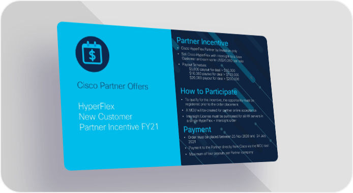 Partner Incentive • Cisco HyperFlex Partner by invitation only • Sell Cisco HyperFlex with Intersight to a New Customer and earn up to US$20,000 per sale • Payout Schedule: $5,000 payout for deal > $50,000 $10,000 payout for deal > $100,000 $20,000 payout for deal > $200,000 Cisco Partner Offers How to Participate • To qualify for the incentive, the opportunity must be HyperFlex registered prior to the order placement • A MOU will be created for partner online acceptance New Customer • Intersight License must be purchased for all HX servers in Partner Incentive FY21 a single HyperFlex + Intersight order Payment • Order must be placed between 25 Nov 2020 and 24 July 2021 • Payment to the Partner directly from Cisco via the MOU tool ©© 2020 2020 CCiisscoco a annd/d/oorr iittss aaffiffilliiaatteess.. AAllll rriighghttss r reesseerrvveed.d. • Maximum of four payouts per Partner company Cisco ASEAN Virtual Partner Conference