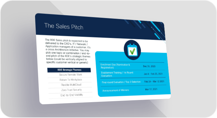 The Sales Pitch The RDE Sales pitch is expected to be delivered to the CXO’s, IT / Network / Application managers of a customer. It’s a cross Architecture initiative. You may pick one topic or combination / end-to- end pitch of the RDE’s strategic themes below (could be vertically aligned to specific customer vertical or generic) Enrollment Due (Nomination & Registration): Dec 31, 2020 RDE StrategicThemes Secure Remote Work Enablement Training / 1st Round Jan 4 - Feb 23, 2021 Evaluation: Return To Workplace Flexible MultiCloud Final round Evaluation / Top 3 Selection: Feb 24 - Mar 12 2021 Zero Trust Security Announcement of Winners: Mar 17, 2021 End-to-End Visibility © 2020 Cisco and/or its affiliates. All rights reserved. Cisco ASEAN Virtual Partner Conference