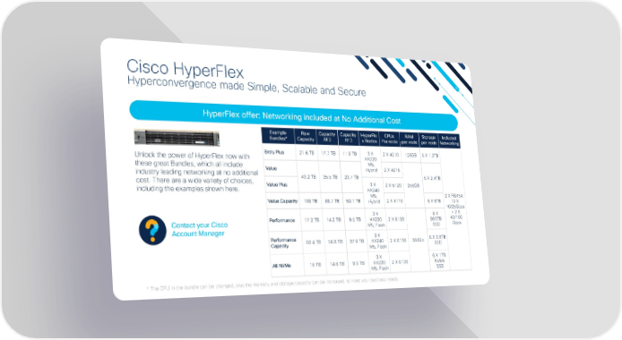 Cisco HyperFlex Hyperconvergence made Simple, Scalable and Secure HyperFlex offer: Networking included at No Additional Cost Example Raw Capacity Capacity HyperFle CPUs RAM Storage Included Bundles* Capacity RF2 RF3 x Nodes Per node per node per node Networking Entry Plus 21.6 TB 17.7 TB 11.8 TB 3 X 2 X 4210 128GB 6 X 1.2TB Unlock the power of HyperFlex now with HX220 these great Bundles, which all include M5, industry leading networking at no additional Value Hybrid 2 X 4216 cost. There are a wide variety of choices, 43.2 TB 35.5 TB 23.7 TB 6 X 2.4TB including the examples shown here. Value Plus 3 X 2 X 5120 256GB HX240 M5, 2 X FI6454: Value Capacity 108 TB 88.7 TB 59.1 TB Hybrid 2 X 4110 6 X 6TB 18 X 10/25Gbps 3 X 6 X + 2 X Performance 17.2 TB 14.2 TB 9.5 TB HX220 2 X 6130 960TB 40/100 Contact your Cisco M5, Flash SSD Gbps Account Manager 3 X Performance 68.4 TB 56.8 TB 37.9 TB HX240 2 X 6130 384Gb 6 X 3.8TB Capacity M5, Flash SSD 3 X 6 X 1TB All NVMe 18 TB 14.8 TB 9.9 TB HX220 2 X 6130 NVMe M5, Flash SSD ©© 2020 2020 CCiisscoco a annd/d/oorr iittss aaffiffilliiaatteess.. AAllll rriighghttss r reesseerrvveed.d. CisCisccoo ASASEEANAN VViirtrtuuaall P Paartrtnneer r CCoonnffeererennccee * The CPU in the bundle can be changed, plus the memory and storage capacity can be increased, to meet your business needs.