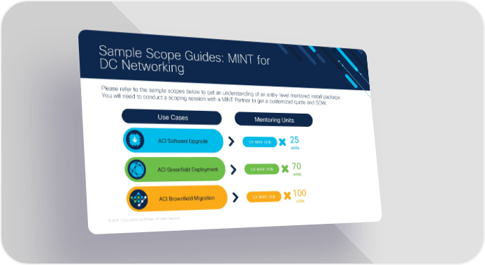 Sample Scope Guides: MINT for DC Networking Please refer to the sample scopes below to get an understanding of an entry-level mentored install package. You will need to conduct a scoping session with a MINT Partner to get a customized quote and SOW. Use Cases Mentoring Units ACI Software Upgrade CX-MINT-DCN 25 units ACI Greenfield Deployment CX-MINT-DCN 70 units ACI Brownfield Migration CX-MINT-DCN 100 units © 2020 Cisco and/or its affiliates. All rights reserved. Cisco ASEAN Virtual Partner Conference