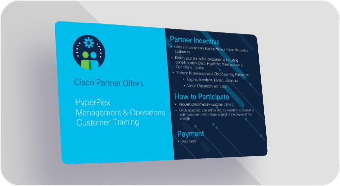Partner Incentive • Offer complimentary training to your Cisco HyperFlex customers • Enrich your pre-sales proposals by including complimentary Cisco HyperFlex Management & Operations Training • Training is delivered via a Cisco Learning Partner in: • English, Mandarin, Korean, Japanese Cisco Partner Offers • Virtual Classroom with Labs How to Participate HyperFlex • Request complimentary customer training Management & Operations • Once approved, you will be sent an invitation to forward to your customer inviting them to enrol in the course at no- Customer Training charge. Payment • No charge ©© 2020 2020 CCiisscoco a annd/d/oorr iittss aaffiffilliiaatteess.. AAllll rriighghttss r reesseerrvveed.d. Cisco ASEAN Virtual Partner Conference